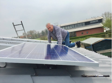 Op de foto Rob, een echte dakhaas bezig met de voorbereidingen voor de panelen.