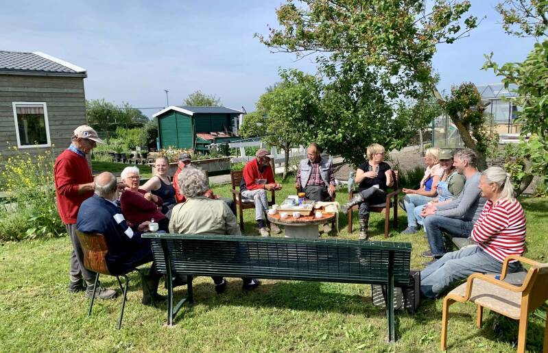 De Werkochtend start om 9.00 uur bij de kruiwagen schuur waar de benodigde gereedschappen worden uitgedeeld. We onderbreken de ochtend met een koffie/ thee pauze met een plak cake en om 12.00 uur zit het er alweer op.
