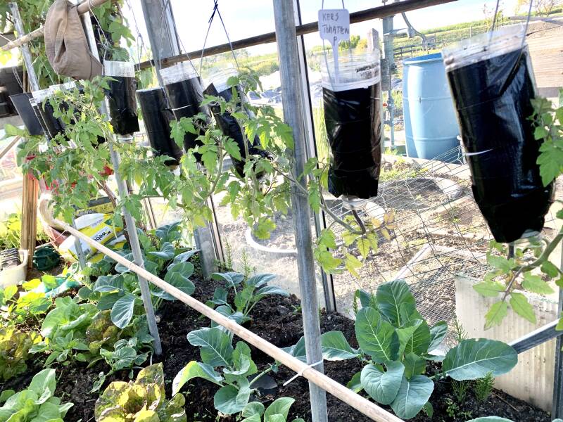 Zo’n idee is tomaten in de kas of daarbuiten op te potten in een plastic fles waaruit de bodem is